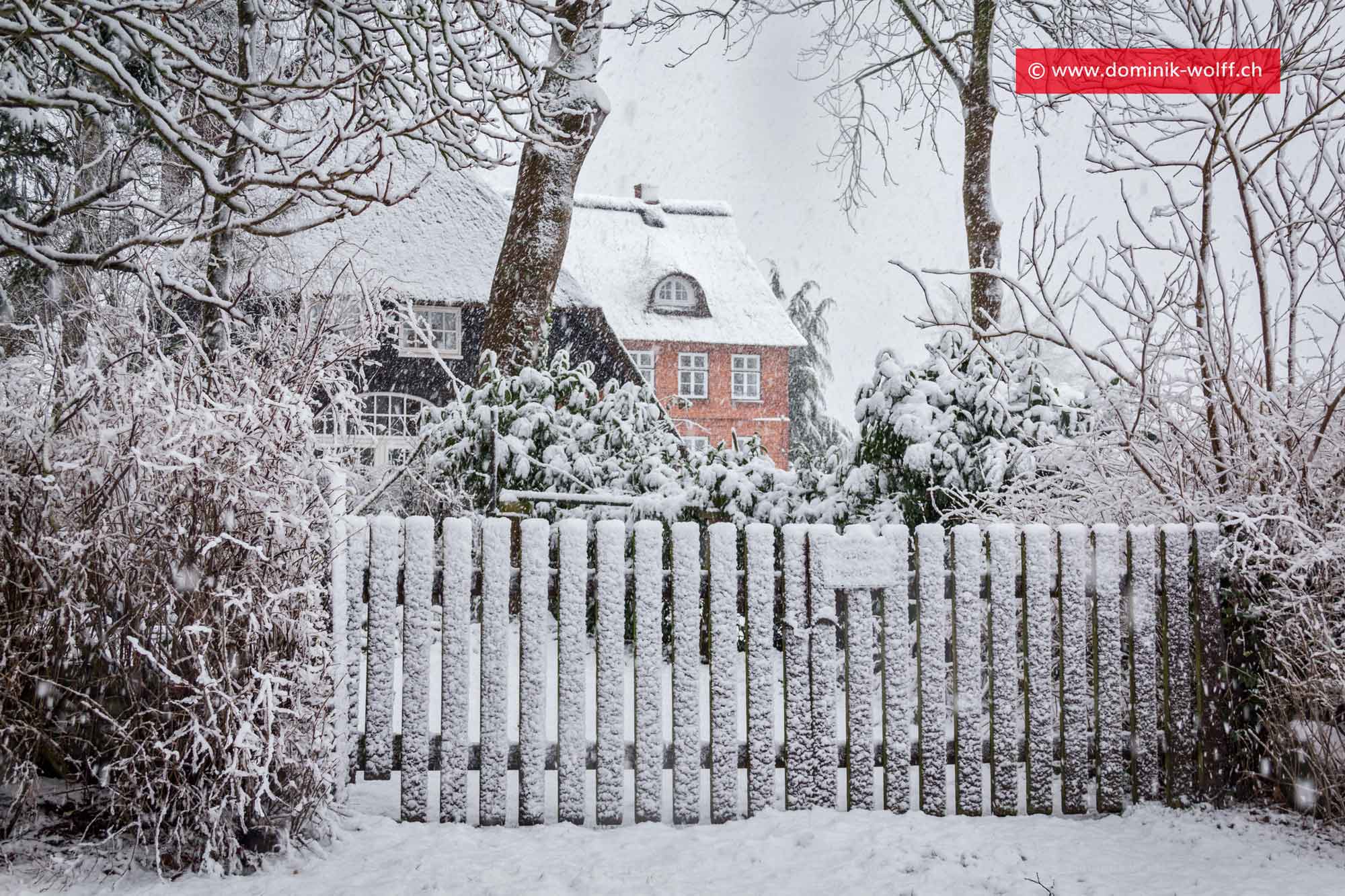 Schöne Winterstimmung in Brodten Großenhof. Im Hintergrund ein typisch norddeutsches Backsteinhaus.
