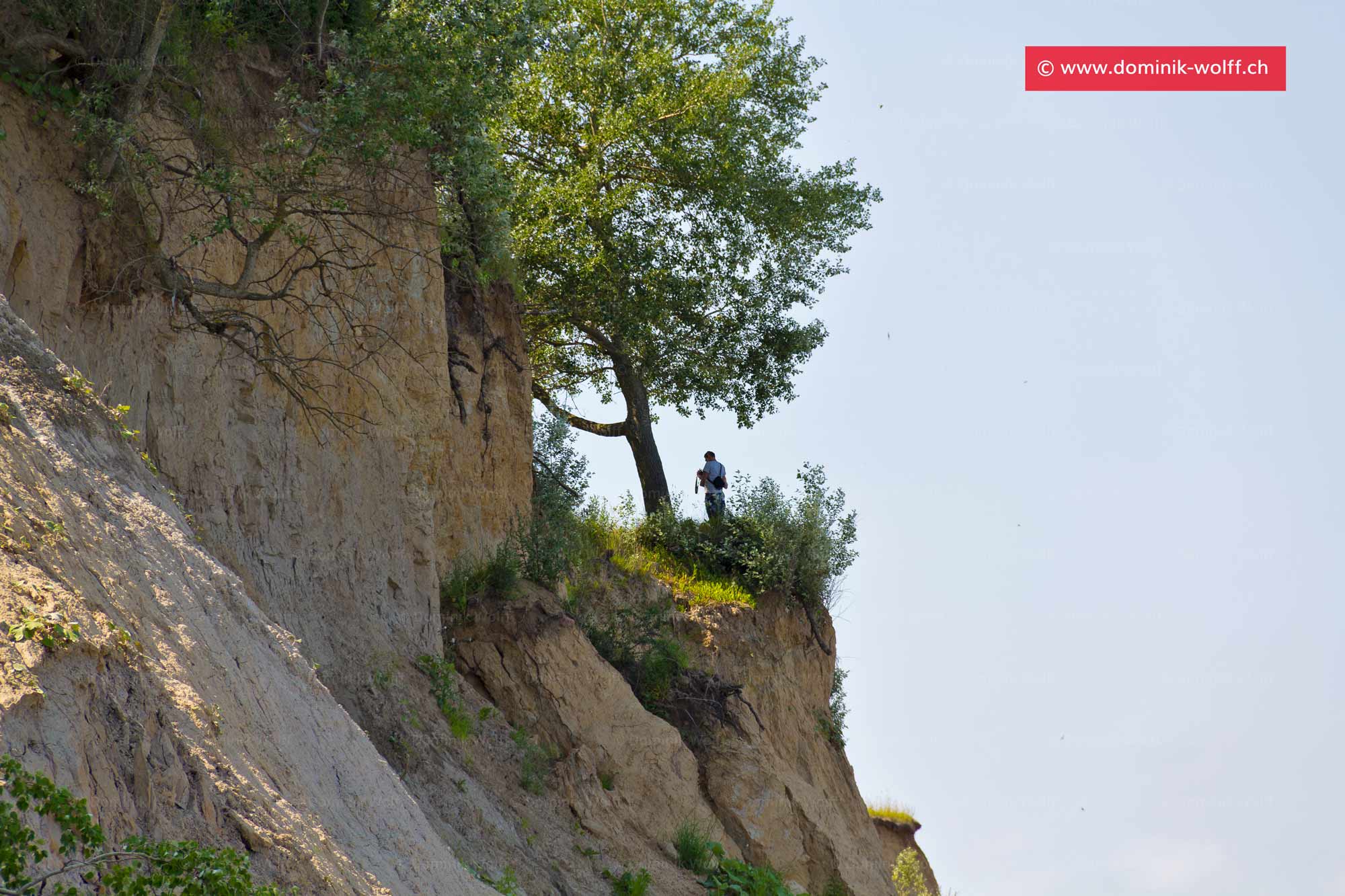 Gut zu sehen, wie ein Baum von seinen Wurzeln an der Abbruchkante gehalten wird. Beim nächsten Dauerregen oder Sturm wird auch er das Steilufer hinabrutschen.