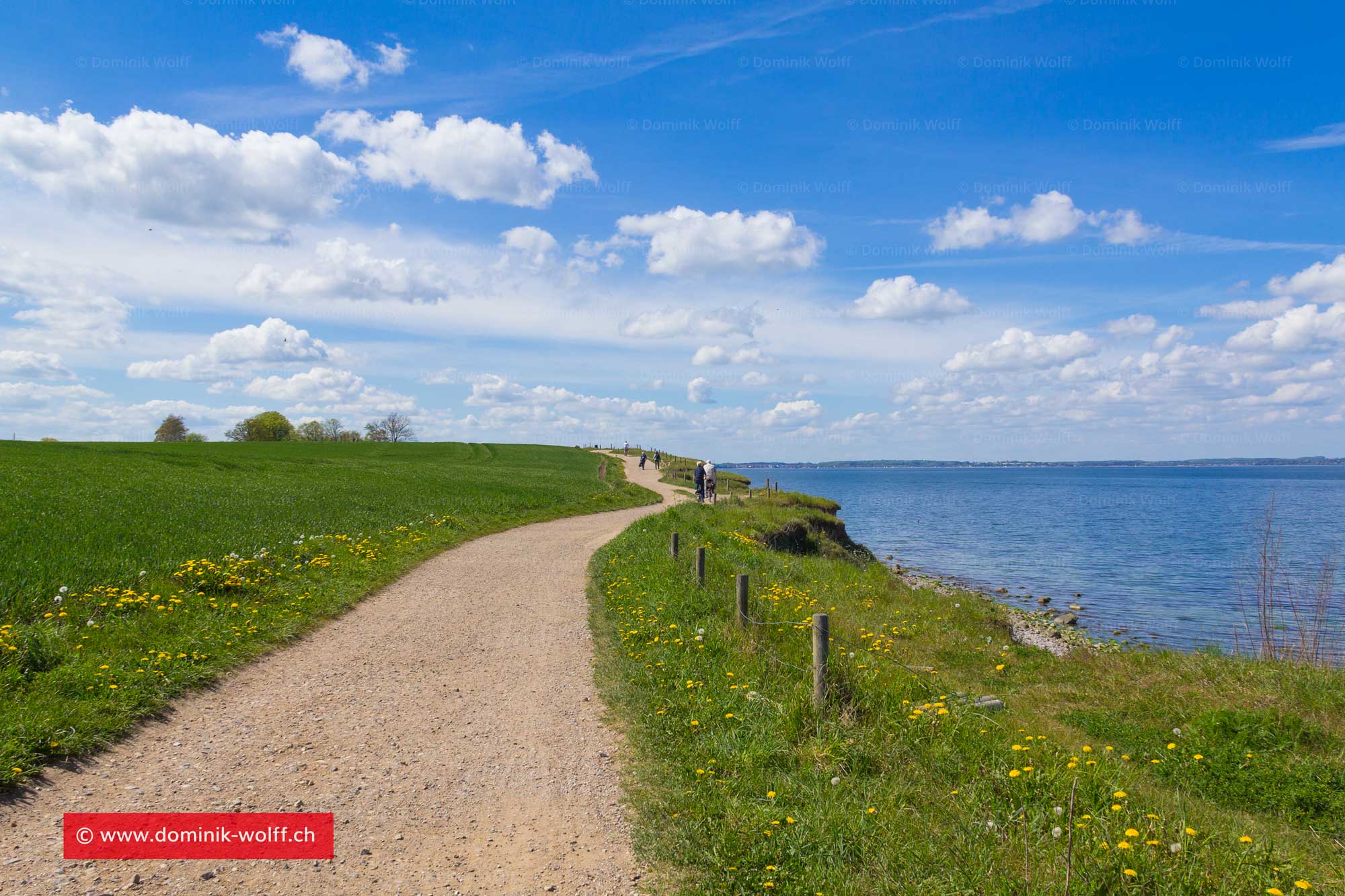 Fahrradfahrer auf der Brodtener Wieskoppel in Richtung Wanderweg und Ostseeküstenradweg Brodtener Steilküste. Die Wieskoppel ist für Fahrradfahrer, Wanderer und Anrainerfahrzeuge geöffnet.