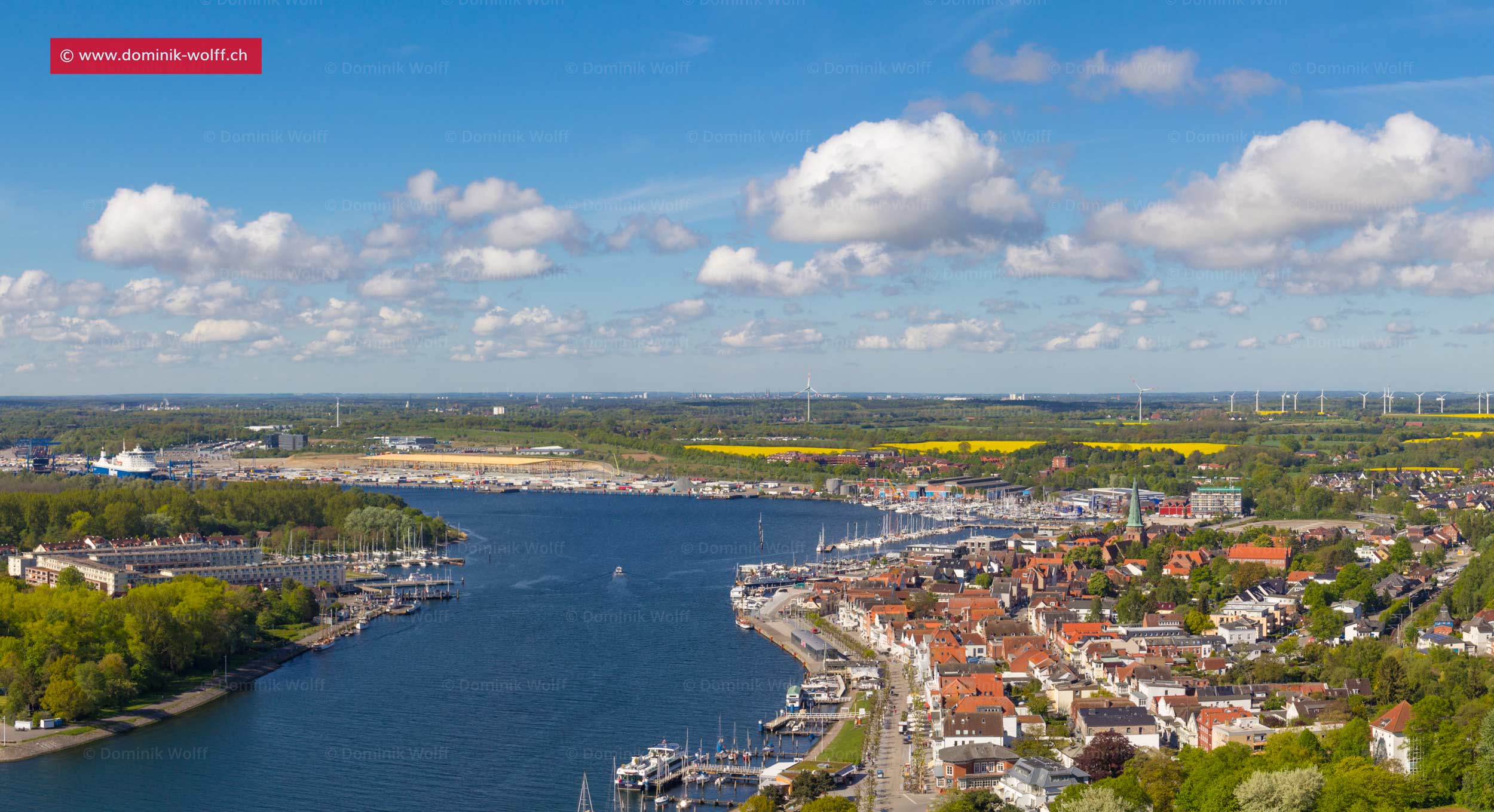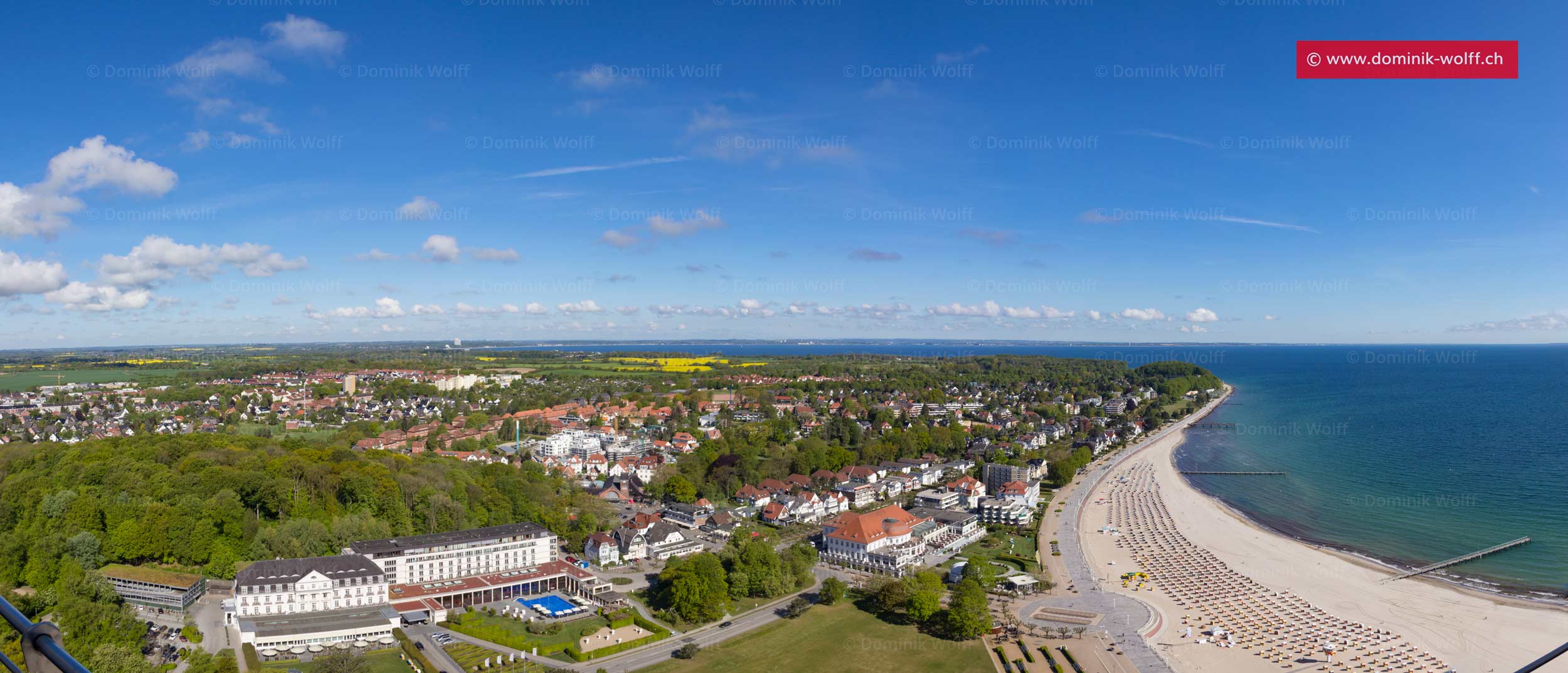 Blick vom Brodtener Winkel über die blühenden Rapsfelder in Richtung Niendorf/Ostsee und Timmendorfer Strand.